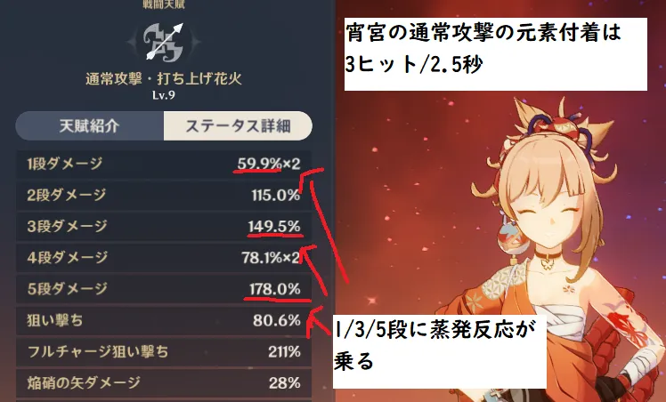 元素付着CD(ICD)の都合上、宵宮はダメージ倍率の一番高い5段目の通常攻撃に蒸発反応が乗ります。