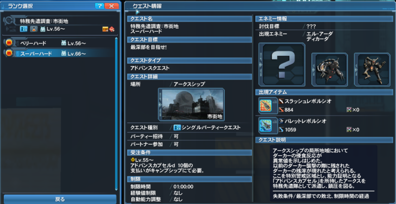 なので、ダーカーだけが出てくる市街地か遺跡のアドバンスクエストを受注します。