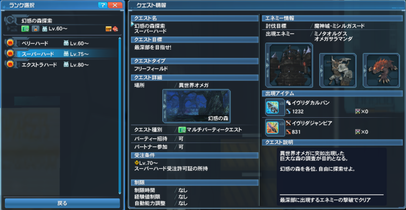 100%になったらとりあえず、レベル関係なく、対応するエネミーを倒せばいいので、難易度ノーマルのダガン殲滅任務:森林を受注してダーカーを倒します。